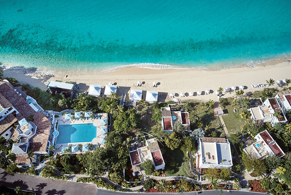 Set above the secluded Baie Longue (meaning “Long Bay”) on the island’s far-west French side, this retreat blends Mediterranean-inspired design with Caribbean warmth. The resort features 83 rooms, suites, cottages and villas — each with whitewashed walls, soft blue tones and private balconies or terraces that open to sweeping views of the sea.